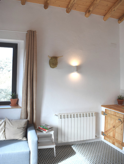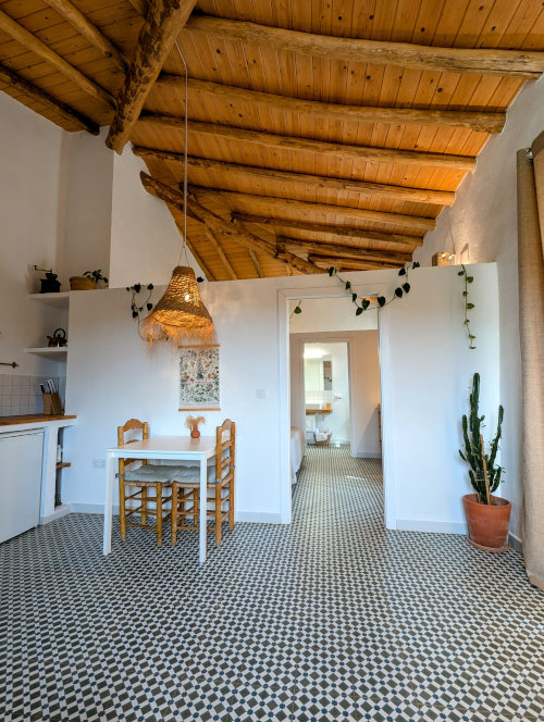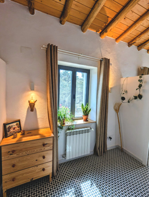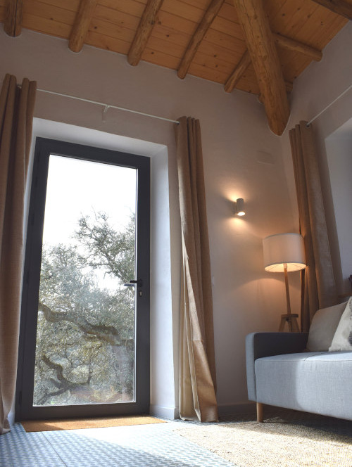 We’ve used traditional Andalusian tiling throughout the apartment and kept an open ceiling so you can appreciate the structure of the typical chestnut roof. The spacious apartment is set on a hill and offers large windows and a glass door to provide you with panoramic views over the farm and its beautiful surroundings. The accommodation features an oversized yet completely private terrace overlooking the countryside.