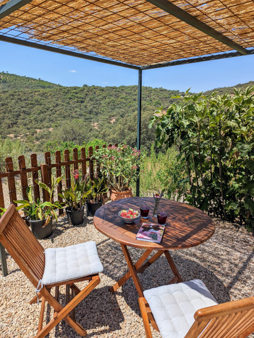 Hemos utilizado azulejos tradicionales andaluces en todo el apartamento y hemos mantenido un techo abierto para que puedas apreciar la estructura del tejado de castaño por excelencia. El cómodo apartamento ofrece grandes ventanales y una puerta de cristal para ofrecerle vistas panorámicas de la granja y sus hermosos alrededores. El alojamiento dispone de una gran terraza privada con zona de comedor bajo una pérgola.